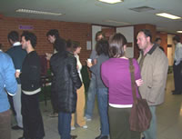 El profesor Fernando Ruiz conversa con algunos asistentes durante el intervalo del seminario. |