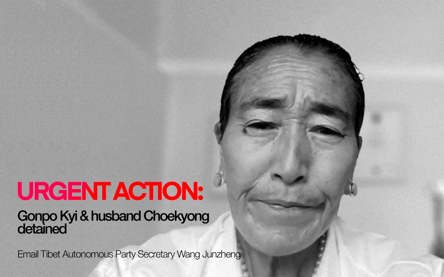 Gonpo Kyi es hermana del preso político tibetano Dorjee Tashi y fue detenida por la policía china en Lhasa el 13 de diciembre de 2023. Se ha informado de que Gonpo Kyi y su esposo, Choekyong, se encontraban en Lhasa para instar a las autoridades a liberar a su hermano, que lleva en prisión desde 2008 y del que se sabe que está muy enfermo.