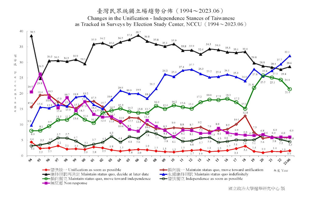 Aunque Taiwán comparte rasgos culturales y lingüísticos con China, y hace negocios con ella, las encuestas han demostrado sistemáticamente que un número muy reducido de taiwaneses -el 1,6%-, ya sean de los "verdes" (más centrados en Taiwán) o de los "azules" (mayor disposición a tratar con China), está de acuerdo con la unificación inmediata con China (el 5,8% cree que Taiwán debería avanzar en esa dirección más adelante). La gran mayoría -los partidarios de la independencia de Taiwán o los que se definen como ciudadanos de la ROC- están unidos en el deseo de que su país siga siendo libre y democrático, y la mayoría lo hace abrazando el "statu quo", o independencia de facto.