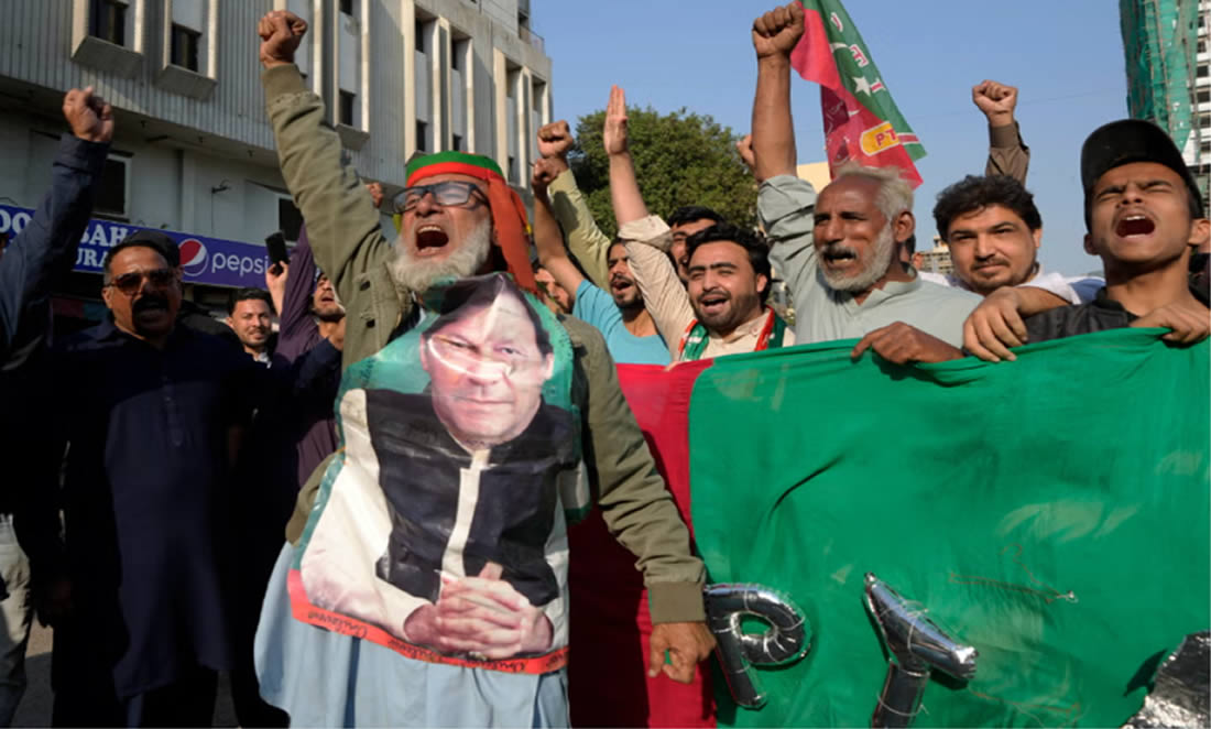 Simpatizantes del ex primer ministro Imran Khan protestando por un presunto fraude en las elecciones generales de 2024. Fuente: Fareed Khan en Associated Press.