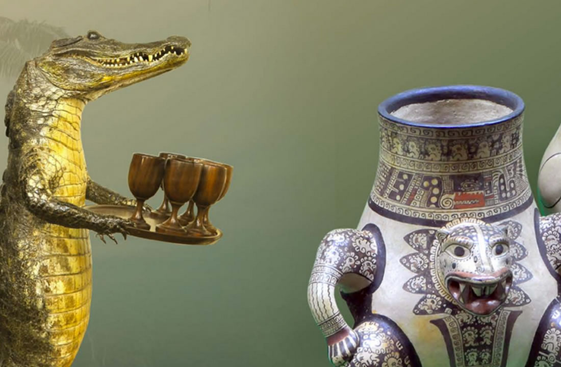 El cocodrilo con la bandeja y las copas que una delegación de Nicaragua obsequió a Kim Il Sung en 1982. Crédito: Foreign Languages Publishing House (Corea del Norte).